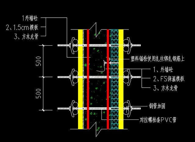 2、工藝原理:將成品保溫板作為主體施工砼外墻模板,通過(guò)特制鉚釘埋件,利用砼自身特性,澆筑砼后,將外墻保溫板與主體砼連接成整體,將外墻裝修階段保溫施工提前至主體施工階段施工。