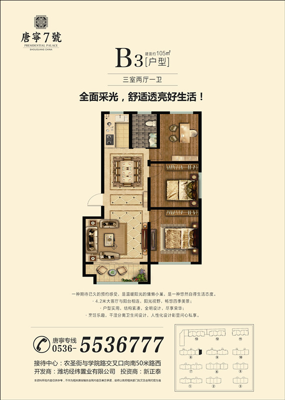 我們的戶型有105——190㎡景區(qū)洋房,210-360㎡的復(fù)式疊拼。我們項(xiàng)目以“ 健康、環(huán)保、人文居住 ”為主題,項(xiàng)目無論是產(chǎn)品定位,還是在規(guī)劃設(shè)計方面,都將打造成**的居住環(huán)境,產(chǎn)品采用通風(fēng)采光效果較好的板式建筑,每一個戶型都是采取設(shè)計師的精雕細(xì)琢。所有產(chǎn)品均是在采取客戶的建議和意見開發(fā)基礎(chǔ)上,結(jié)合壽光本地居住習(xí)慣設(shè)計而成,所有房源均南北通透,方正實(shí)用,保證居住舒適性。