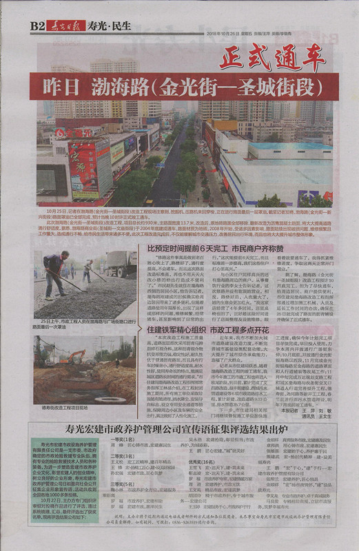 由我公司承建的渤海路改造工程于2018年10月25日晚22點通車 (本文來自于壽光日報、壽光網)